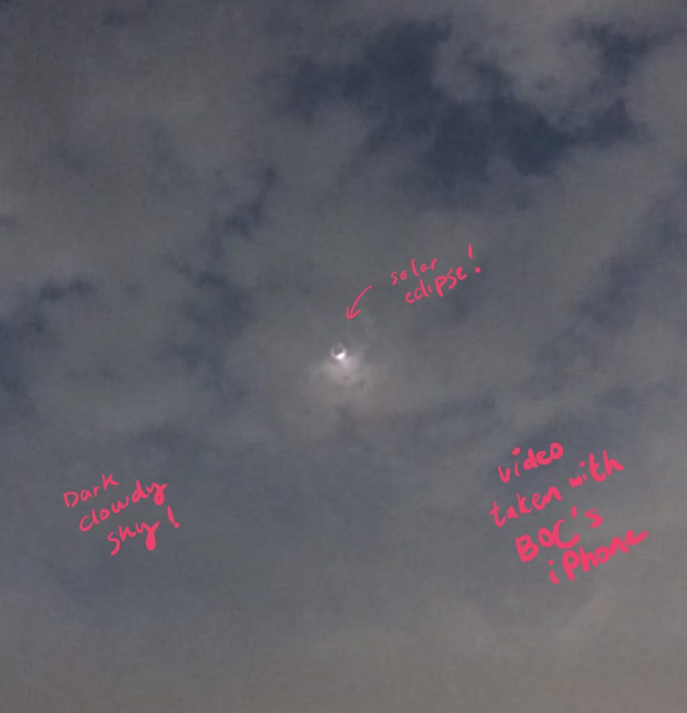 Total Solar Eclipse, though, that must be experienced in person. You don’t even notice there’s something going on, even at 90% partial eclipse. But it’s happening. Starting 12 at noon, which was an hour before totality, I checked every ten minutes– with proper solar glasses. And I could see the moon covering the sun, slowly but surely. Then, about ten minutes prior to totality, the sky visibility darkens. The temperature drops. You wonder if the sun is hidden in the clouds, but it’s not. When you check the sun through the filters, it’s a tiny orange sliver-shaped like a reverse crescent moon. Then…